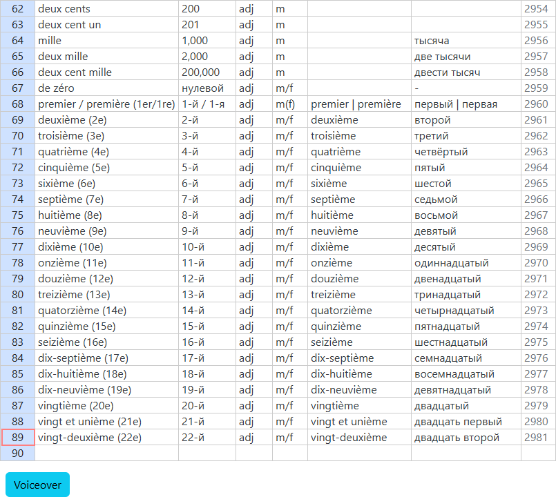 — Да всё целиком берите, и «ième»! Там озвончение будет. Да! Вы какой хотите? 99-й? QUATRE-VINGT-DIX-neuvième …только что НРЗБ, потому что [f] там трудно произнести. Там оно озвончается, потому что тяжело.